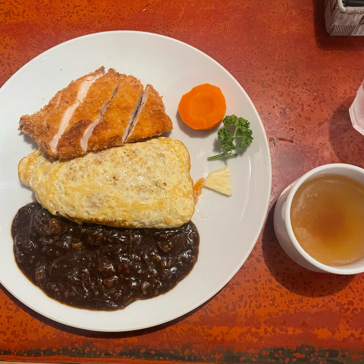 チキンカツには味がしっかりついていて、オムライスとの相性👍ハヤシも濃いめの味でオムライスとの相性👍とっても美味しかったです☆