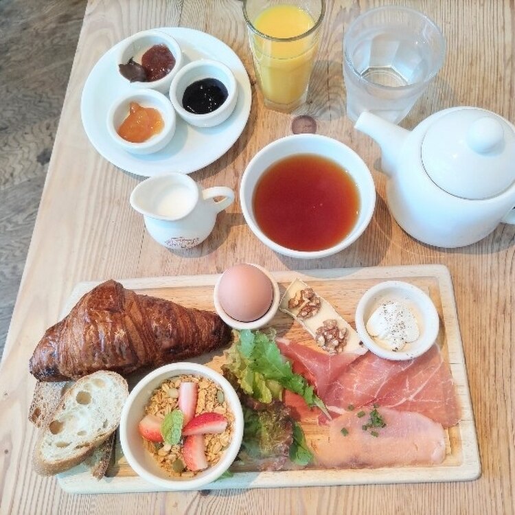 クロワッサン、パン2種、サラダ、エッグ、サラダ、生ハム、チーズ、ブルーチーズ、くるみ、季節のグラノーラ、オーガニック紅茶、オーガニックオレンジジュース♡高級ジャムもつけ放題♡朝から幸せ〜🥰1日のスタートにぴったりです🙋✨
