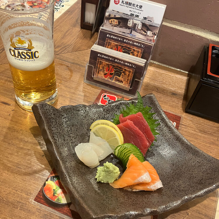 海鮮を中心に20店舗が入ってる屋台村形式です。札幌で昼間から屋台村なんて天国😂