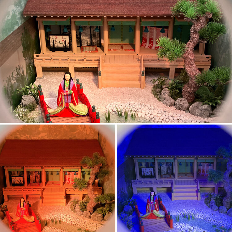 照明装置の入った箱を除くと中にはミニチュアのセットが。日中・夕方・夜の3つのパターンの照明でセットの見え方が変わる様子を体験でき、日中から夕方、夕方から夜に変わっていく時の色合いがとても綺麗でした。
