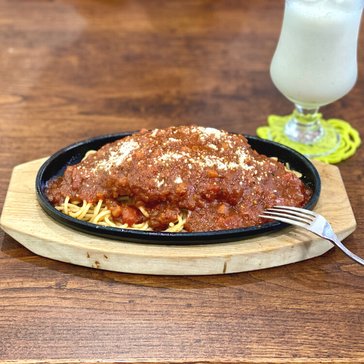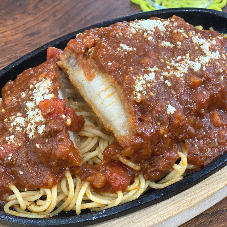 カツミートと呼ばれることもあるスパカツは、スパゲティの上にカツを乗せて上からミートソースをかけた釧路グルメ。