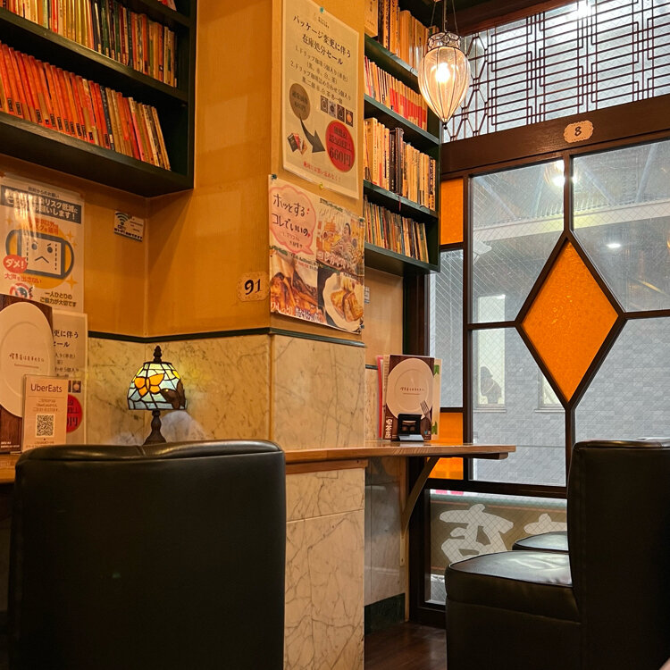 窓は色の入ったガラスだったり照明もレトロな感じです。