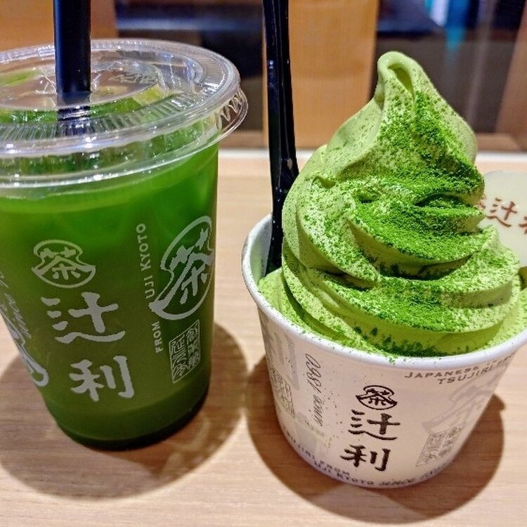 京都旅 京都駅前の辻利。 グリーンティー(ノンスウィート)&抹茶ソフト。 パワーチャージできました!