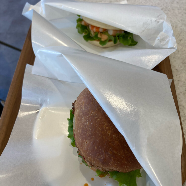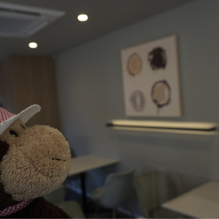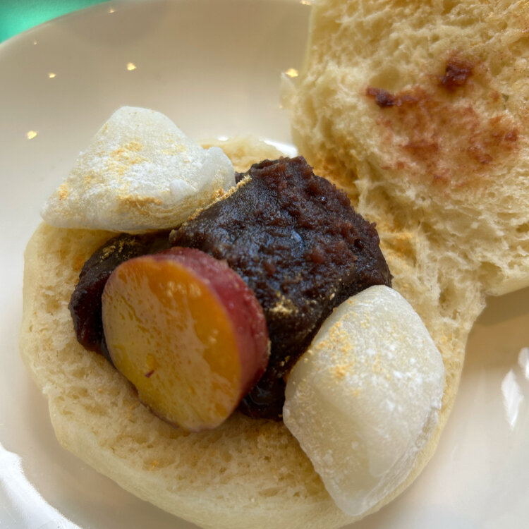 2階のイートインコーナーで、もちもちのベーグルにたっぷりの餡子とお餅と月に見立てたさつまいもにきなこをかけて挟んだ「お月見サンド」と「京ほうじ茶ラテ」を頂きました。