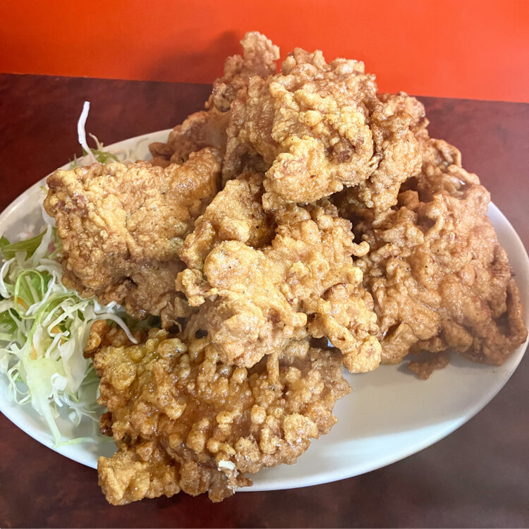盛岡出身の作家くどうれいん さんのエッセイで知った盛岡食堂の唐揚げを食べてみたく、盛岡城跡公園から歩いて向かいました。今回は距離が近そうな高松店にしましたが、開店の1時間前に着いてしまい、他に時間を潰す場所もわからないので、店の前に立って並んでいたところ、お店のおばさまが中に入れてくれ、待合席を案内してくれました。そして寒いからと、温かいお茶も出してくださり、食べる前から感激しました。定食もありますが、ご飯より麺の気分だったので、唐揚げは単品で味噌ラーメンと一緒に頼みました。とにかく盛りがよく、ラーメン鉢は大きめの洗面器くらいありますし、唐揚げはゲンコツサイズが7つも付いてます。おばさまの優しさに応えたくて、なるべく残さないようにと、ラーメンは完食、唐揚げも4つ頑張りました。残すのが申し訳ないと思っていると、お持ち帰り用の袋をくれ、いいお土産ができました。唐揚げは衣はガリっと、中はジューシーで、後で気づいたら口内の皮が剥けていました。たくさん食べたのにもたれることがないのが不思議でした。