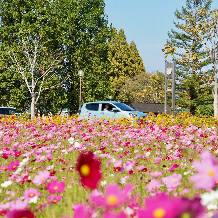 🌸コスモス✖️バス🚌小野ひまわりの丘公園🌻 小野市のひまわりの丘公園。車シリーズ🚗🚙 コスモス畑のそばを車もトコトコ走っていきます。 #秋の彩り #兵庫 #小野市 #ひまわりの丘公園 #コスモス #らんらんバス #トコトコトコ♥︎♬*.:*¸¸🚌 #車もトコトコ🚗🚙