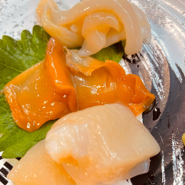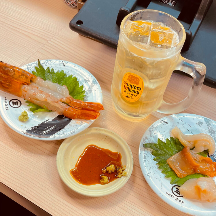 餃子の次は、海鮮と決めていたので大好きな雲丹が見つからず次に好きな海老🦐と貝三種🐚に決めて、飲み物はハイボール。