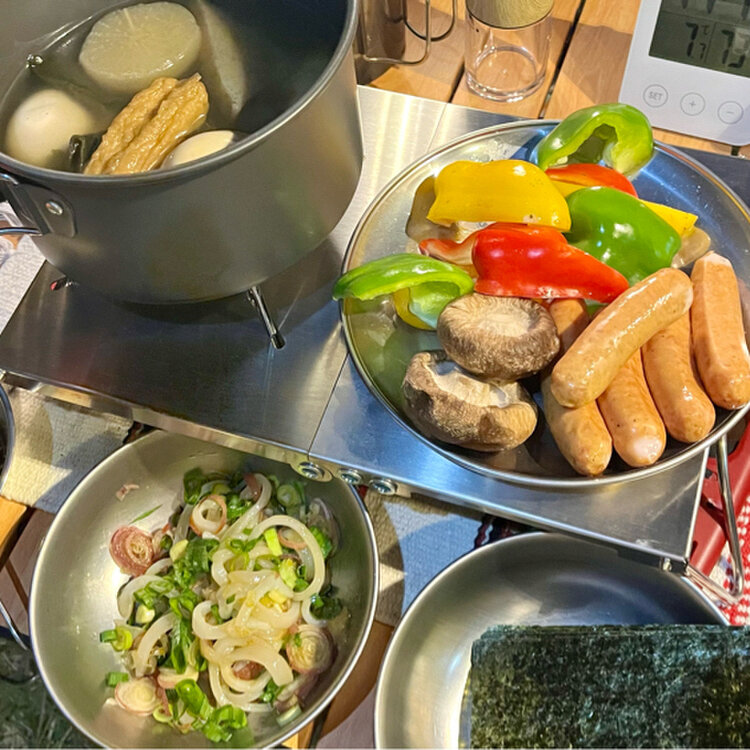 晩御飯は、これからあたためるおでんとこれから焼くバーベキューとイカのおつまみ。