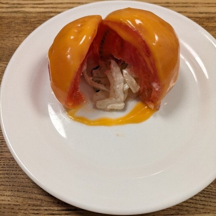 Lunch 「いつもありがとうございます」 って・・・ 覚えていてくれてるのかなぁ🤔 🍅サラダ トマトをカットすると鶏肉と玉ねぎドレッシングサラダ 簡単レシピなんだけど この味は上手く出せないな🤔 なので ココでいただきます