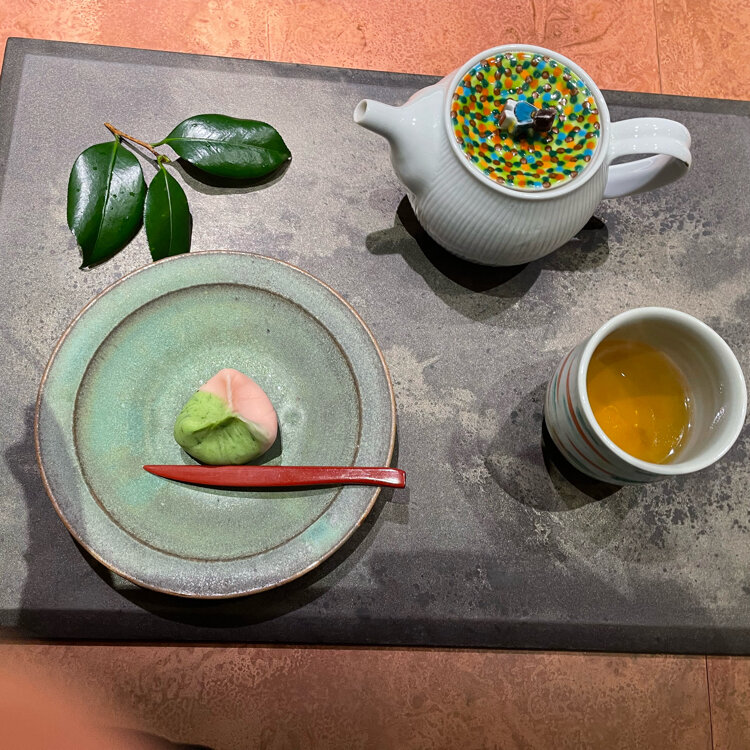 一笑さんのほうじ茶 加賀棒茶を入れていただく お茶やお菓子が美味しいことはもちろん うつわや添えられた椿の葉の瑞々しさ あちこちにこだわりを感じます