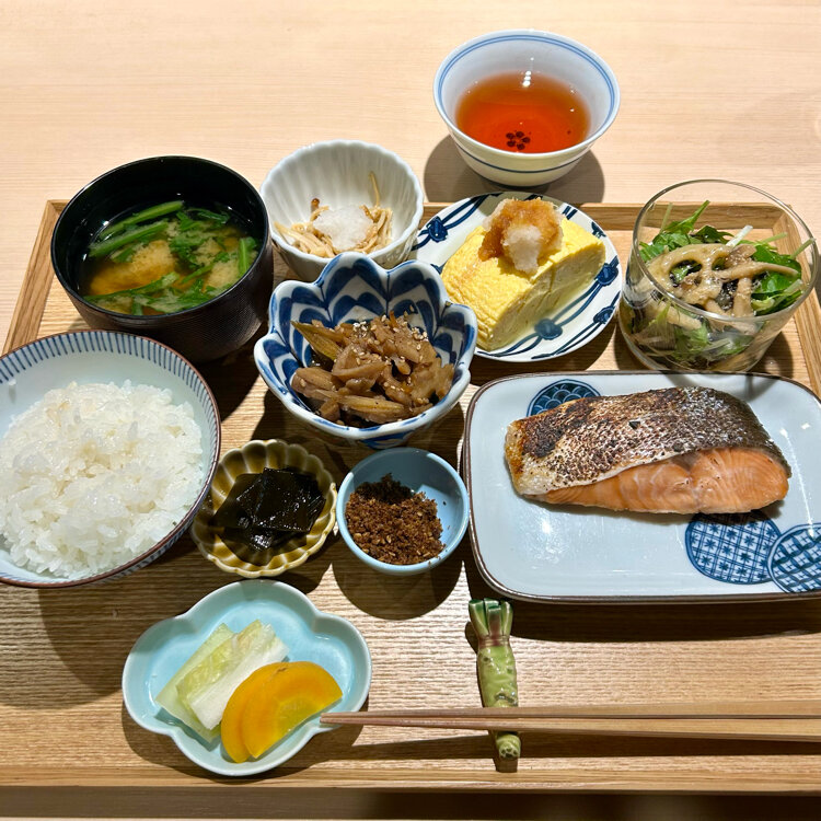 こだわりの炊き立て土鍋ごはんを中心にした、季節のおばんざい、だし巻き、西京焼きなどの京都の朝御膳を頂きました。