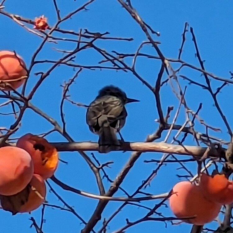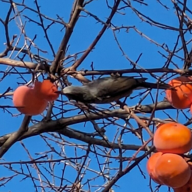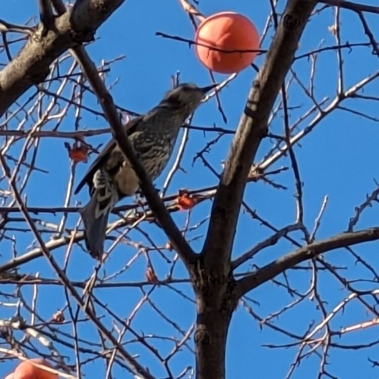 このコはだあれ? 美味しそうな柿をついばんでいます😄 青い空にオレンジ色の柿 映えます😄