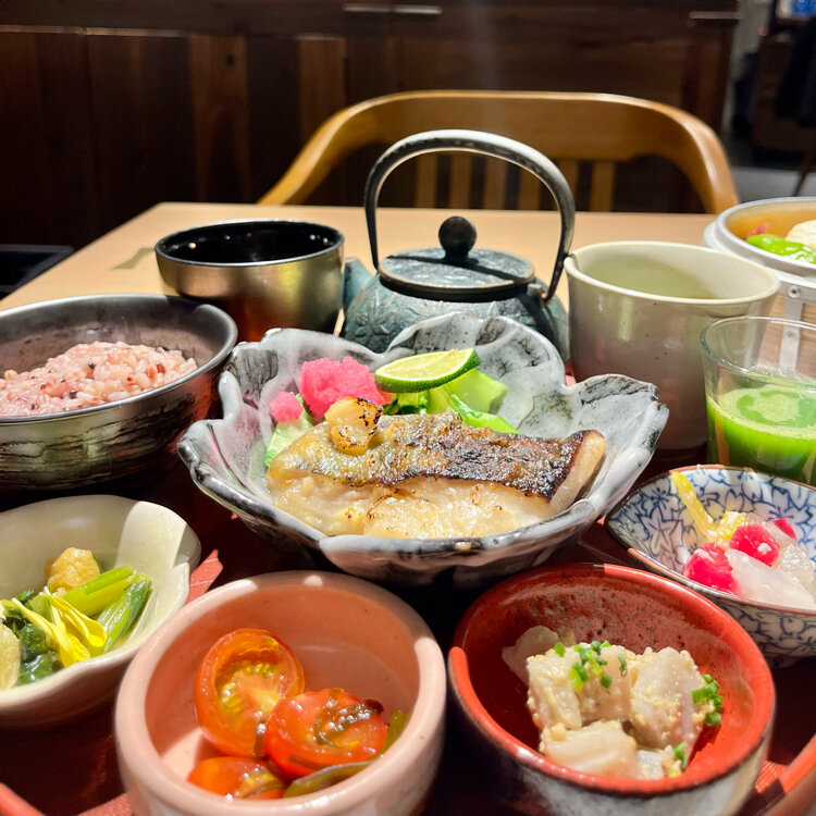 銀鱈の西京味噌焼きをオーダーし、十六穀米を少なめにして野菜とおぼろ豆ふのせいろ蒸しを追加しました。