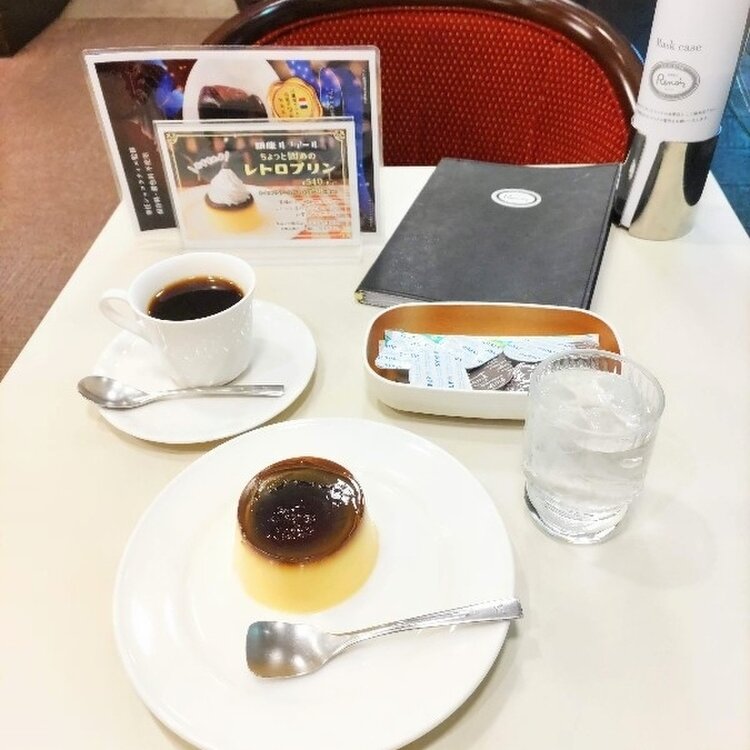 ころすけ🌱のぷりんシリーズ🍮🎵その128 大好きなぷりん特集になります✨ 日暮里〜千駄木さんぽ途中に休憩♡ レトロプリンと本日のコーヒー🍮😋☕✨ 可愛いプリンの看板につられてふらりと入室〜🤭 赤いレトロな椅子が喫茶室という感じで落ち着いてて気軽な感じがいいです♡ 弾力のあるプリンは冷凍かしら🤭(失礼しました🙏✨)ホイップありなし選べます♡