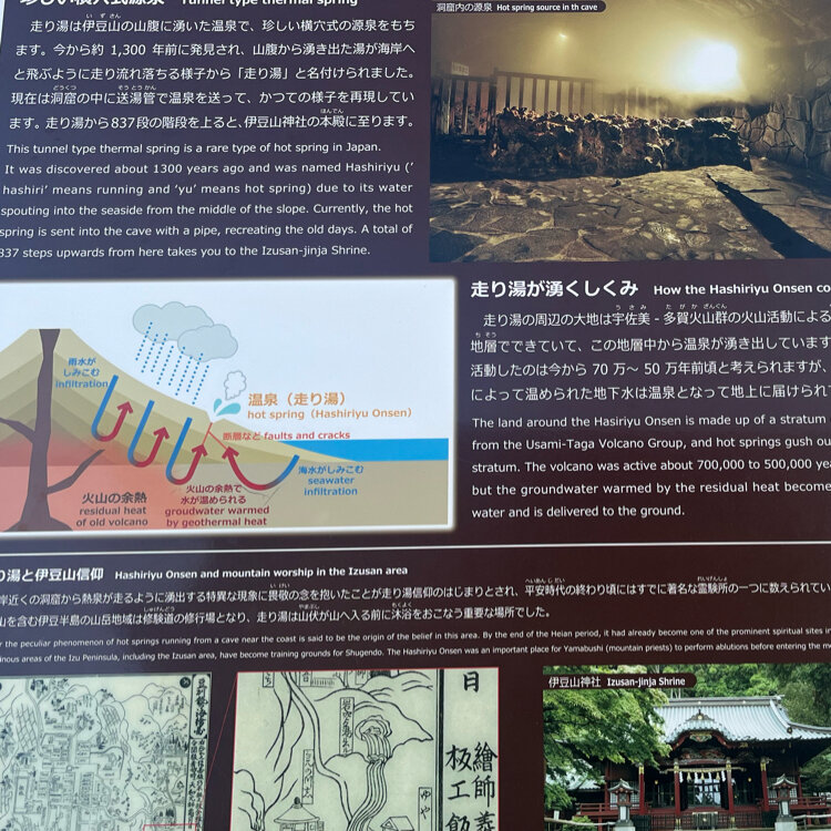 走り湯 日本でも珍しい横穴式の源泉、日本三大古泉の一つです。 洞窟に入ると蒸気が充満しまるで天然サウナのよう。 奥にはぼこぼこと温泉が湧き出ていました。 熱海の穴場スポットです。