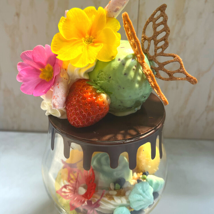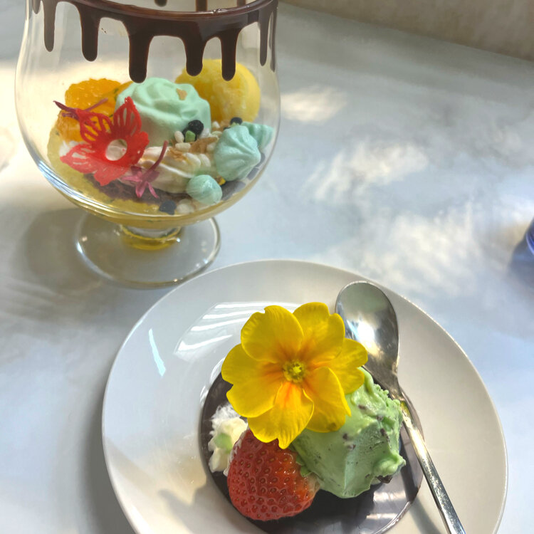 ミントアイスに可愛くちょこんと蝶々がとまっていて、グラスの中にもチョコミントソルベ、