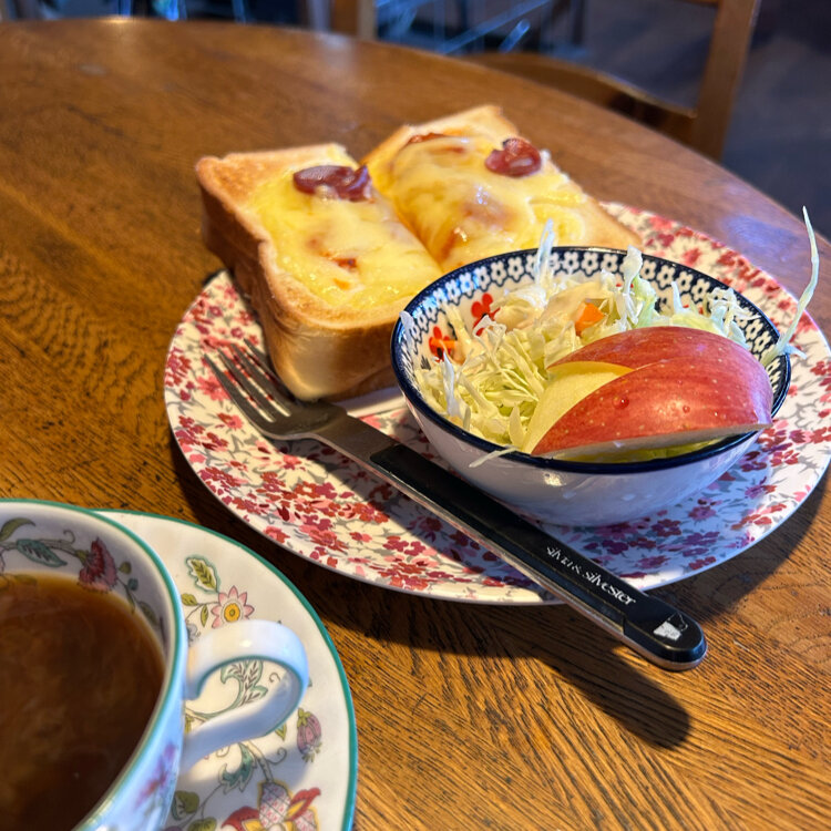 ピザトースト🍕が美味しそうです♪ さりげなくサラダに🥗添えてある、ウサギちゃん🐇の林檎が癒されます🍎