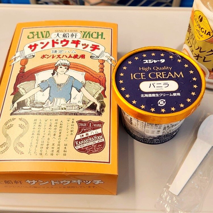 【今年もまた祇園祭】その1 🫐ブルーベリーの[わかさ生活]の本社ビルから祇園祭・巡行を観覧して 『抹茶とブルーベリーの〈アフタヌーンティ〉を味わう』というイベントがあり応募しました 当落わからぬ前に6月の初めに🚅とホテルを予約。 祇園祭だから混んでいるんだろうな...と思ったのですが意外とガラガラ 肝心の結果は... '`,、('∀`) '`,、落選でした 結局2年連続、祇園祭・宵山、巡行見学の個人旅行になってしまいました いろいろ戦略を立てて旅行の始まり‼️ ちなみに駅弁は『大船軒のサンドウィッチ』明治32年に日本で初めてサンドウィッチを駅弁にして売り出したそうです ハムとチーズのシンプルスタイルなんですが〈鎌倉ハム〉を使用。鎌倉ハムのブランドもこの頃にできたそうです ハムが歯応えがあってうまい😋 東海道新幹線は車内販売がないのでホームの自販機でカチコチ🧊で有名なスジャータアイスクリームを買いました 40分後に食べたらダラダラとけている😅 自販機はそんなに冷やしてないのかも⁉️ #サンドウィッチ#大船軒 #スジャータアイスクリーム