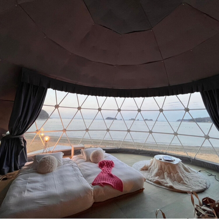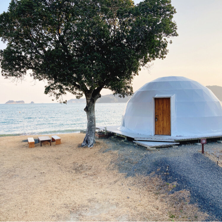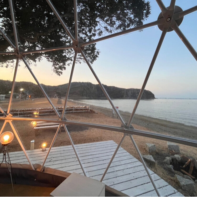 ドームテントと海の青がすごく綺麗!朝も夜も写真映えするお宿です。