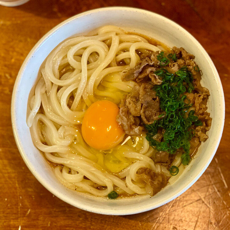 旦那さんのは甘辛く煮込んだ牛肉の「汁なし肉かまたまうどん」。