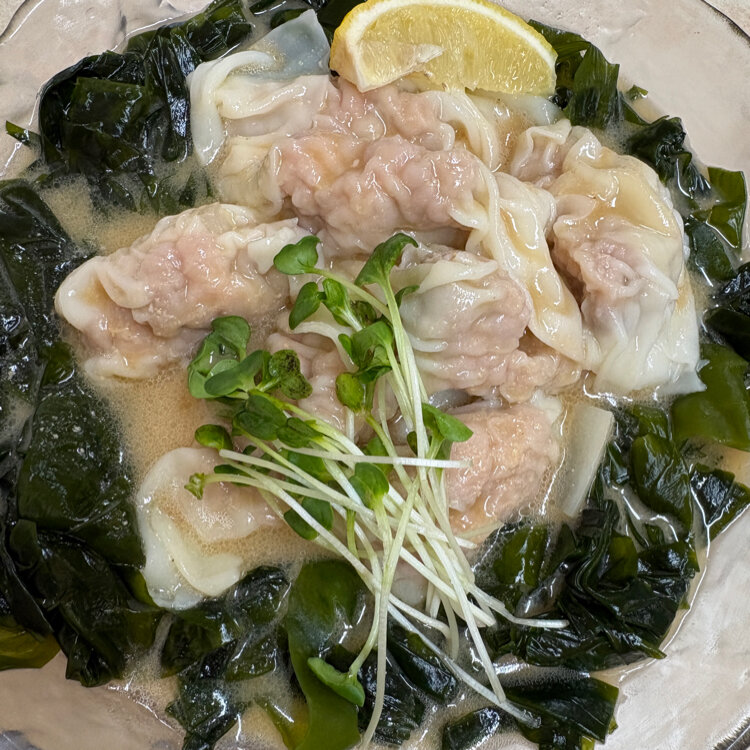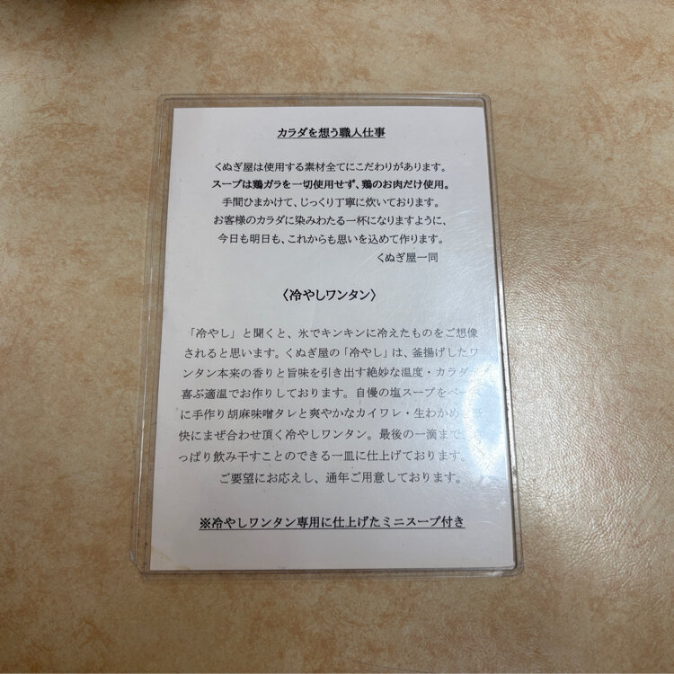 伊勢佐木町のモールより少し横浜寄りのワンタン店「くぬぎ屋」さんで、前々から気になっていた冷やしワンタンをいただきました。 (3枚目の写真はワンタンスープ) 冷やしと言ってもキンキンに冷えてるわけではなく、程よい温度で味噌味のスープと合わさってとても美味しくいただきました。