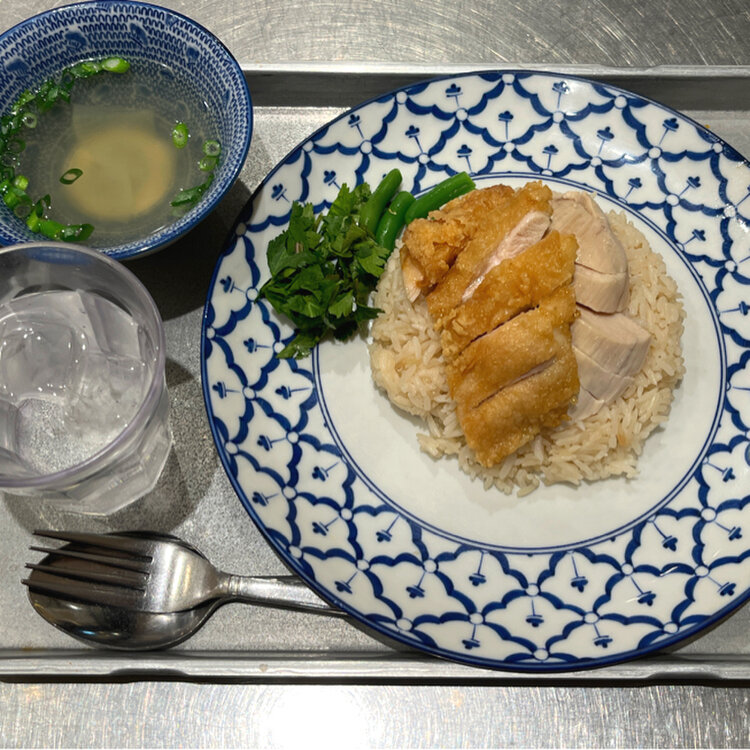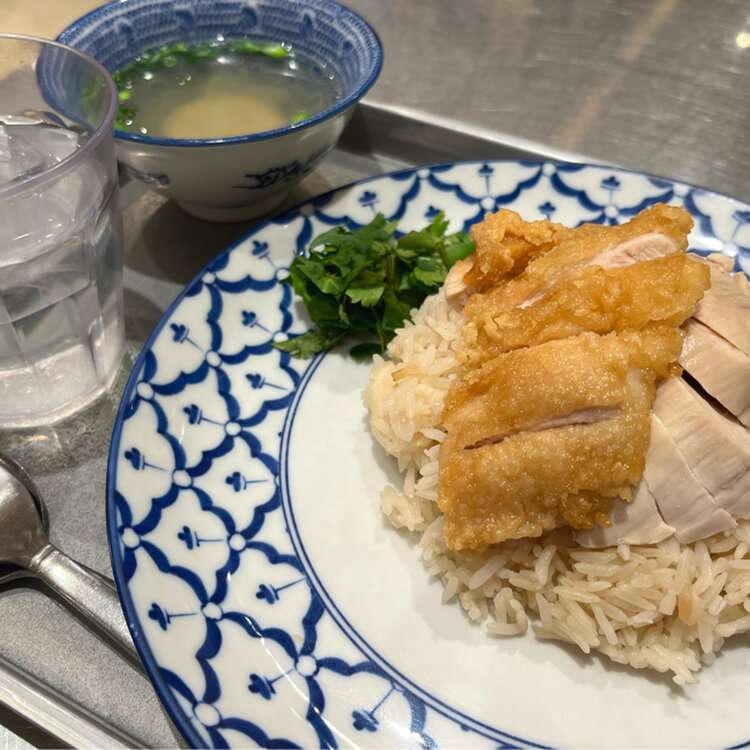 カオマンガイキッチン エキュート大宮にて、ダブルカオマンガイ(茹で&揚げ)🥳 卓上には8種のソースがあり、好みの味を探せます。更に揚げ•••アリだな😋