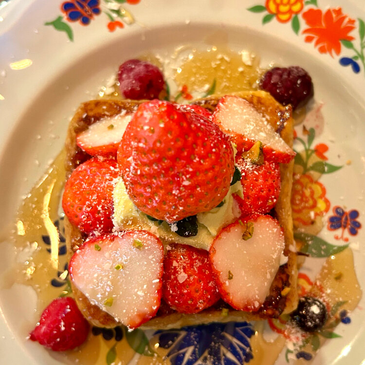 とろっと柔らかいフレンチトーストの上には、いちご、濃厚なピスタチオクリーム。ハチミツの優しい甘さ、ベリーの酸味がプラスされて、最後の一口まで美味しくて、心配する事無くペロリでした。