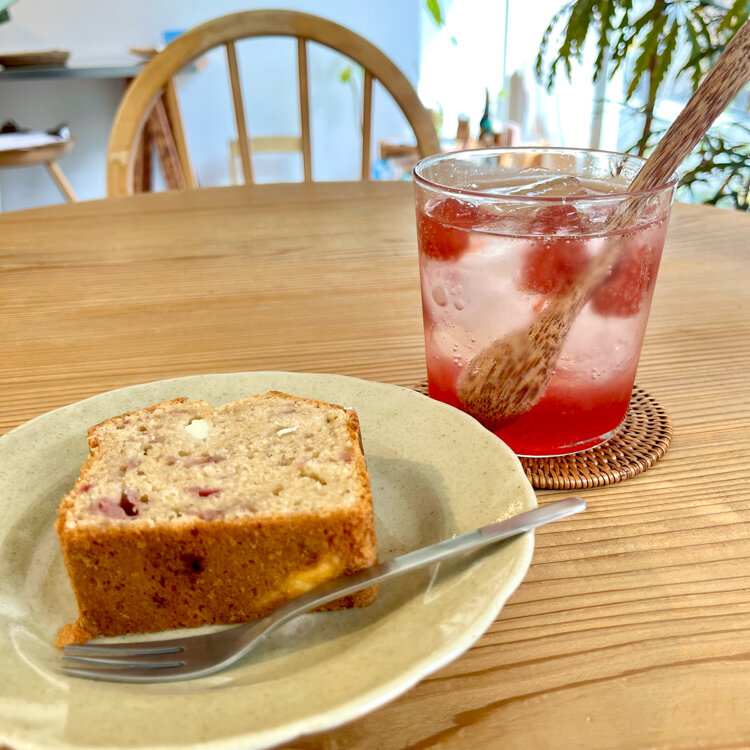 食後には季節のシロップジュース(いちご)のソーダ割りと本日のおやつのパウンドケーキ。