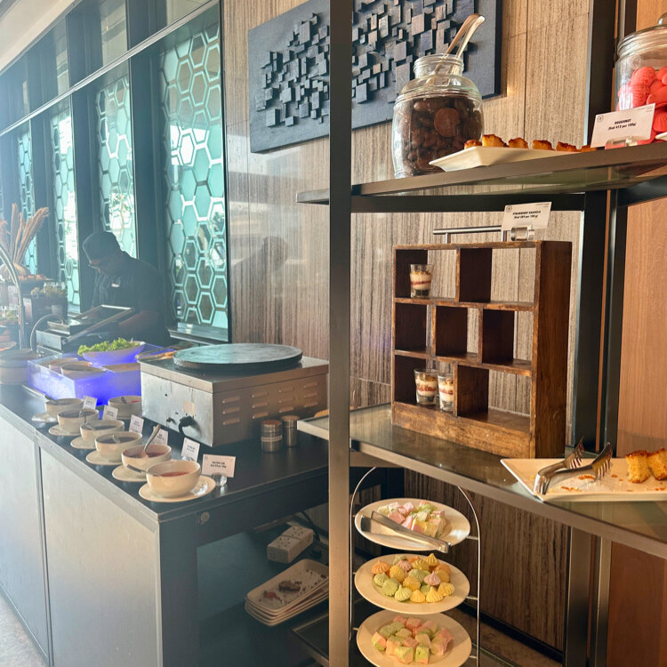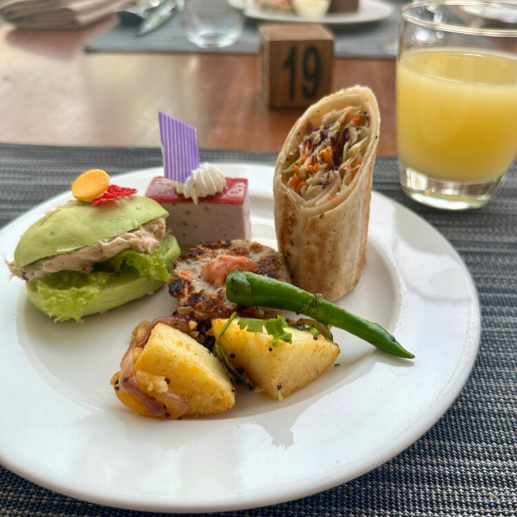 朝はこのスリランカ旅では初の朝食ビュッフェ。スリランカ料理のラインナップも豊富、そしてパンやスイーツ、インターナショナルなお料理もたくさんあって、久しぶりにトロトロのオムレツを作ってもらいました。旅行中は特に野菜を欲するので、ほぼ野菜の盛り合わせみたいになっちゃいますがとってもおいしくいただきました。