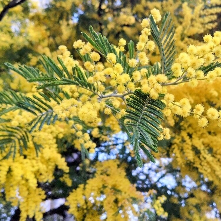 近所のミモザも見ごろです。 通りがかる人は見上げたり携帯で撮影したり。みんな楽しみにしています😊 風が吹くと黄色の枝がゆったりと揺れていました。