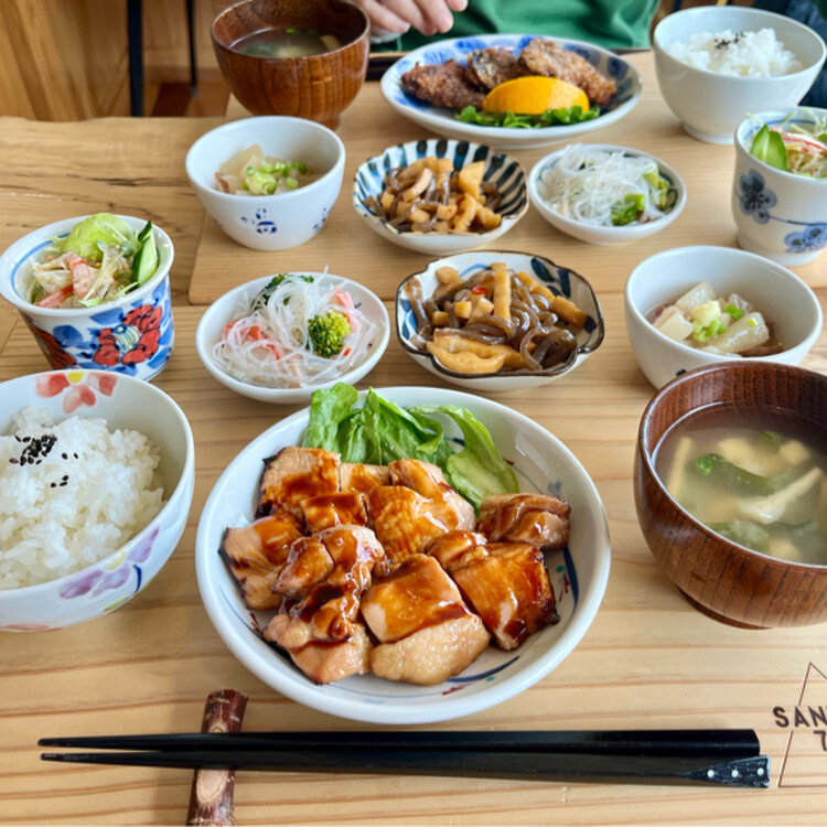 小鉢は、サラダ・こんにゃくとレンコンの甘辛炒め・春雨の酢のもの・大根の煮もの