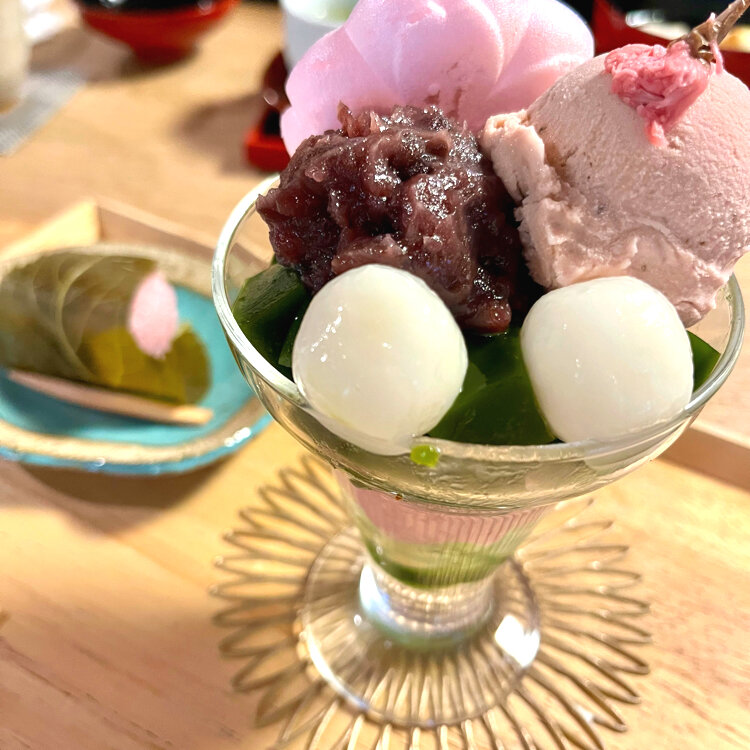 サクラジェラートの上には桜の塩漬けものっていて、餡子、白玉の入った和パフェです❣️