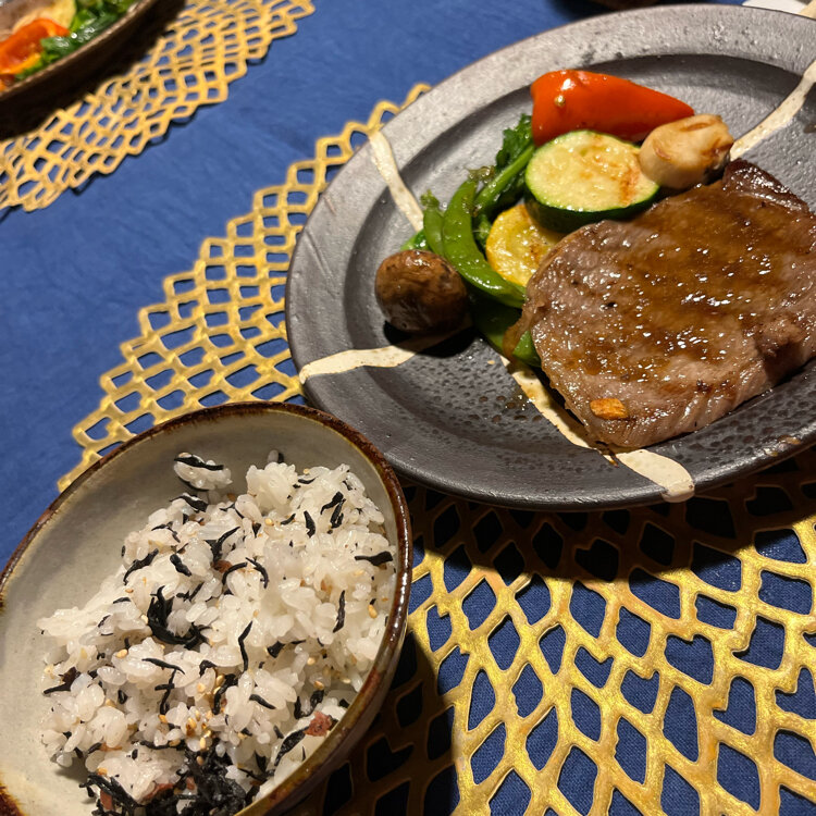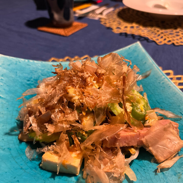 コース仕立てのお料理に、沖縄らしく、ゴーヤチャンプルー、石垣牛のステーキなどが出てきました。