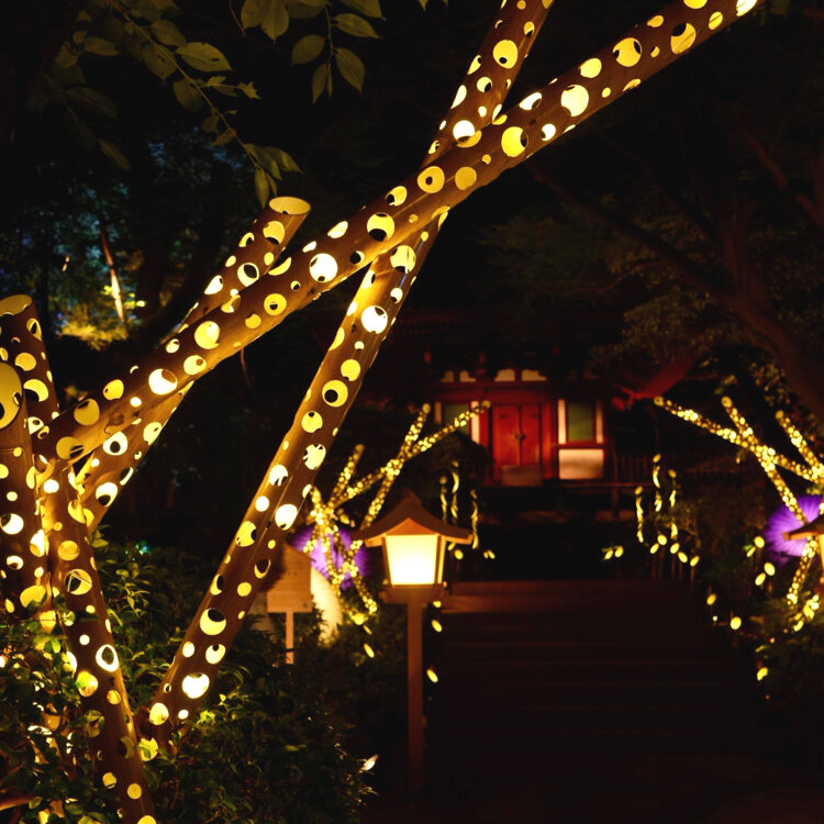 高輪エリアのプリンスホテルの広いお庭に広がるアートな夜の竹あかり。