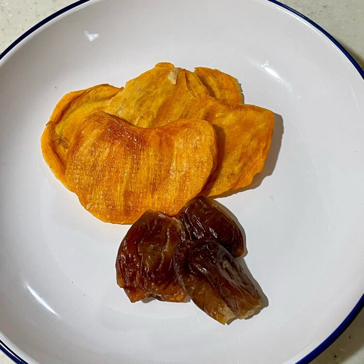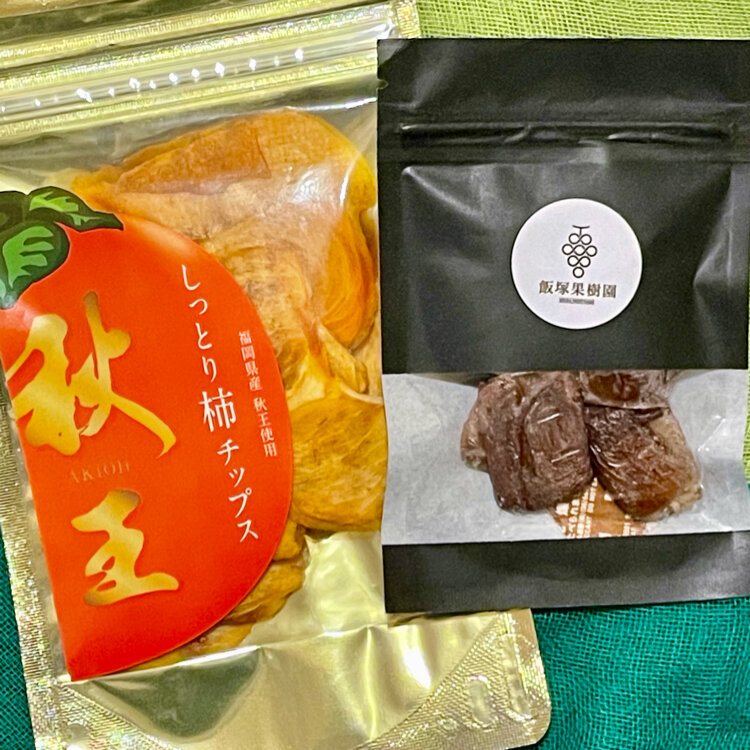 福岡県朝倉市の柿チップスと長野県上田市の干しブドウを出張のお土産で頂きました♡