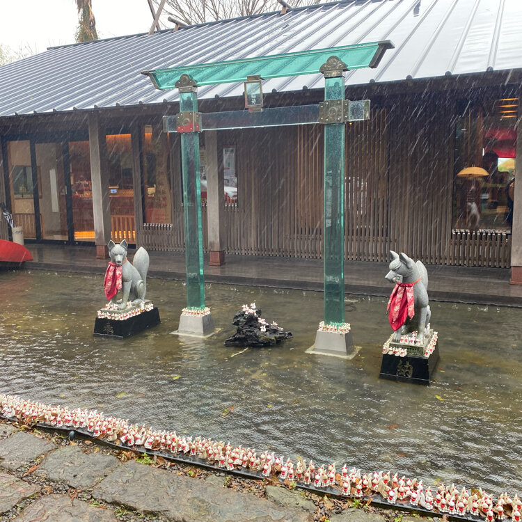小さい神社ですが、透明の鳥居で珍しい。 かなりの悪天候でしたが参拝客が数組いました。