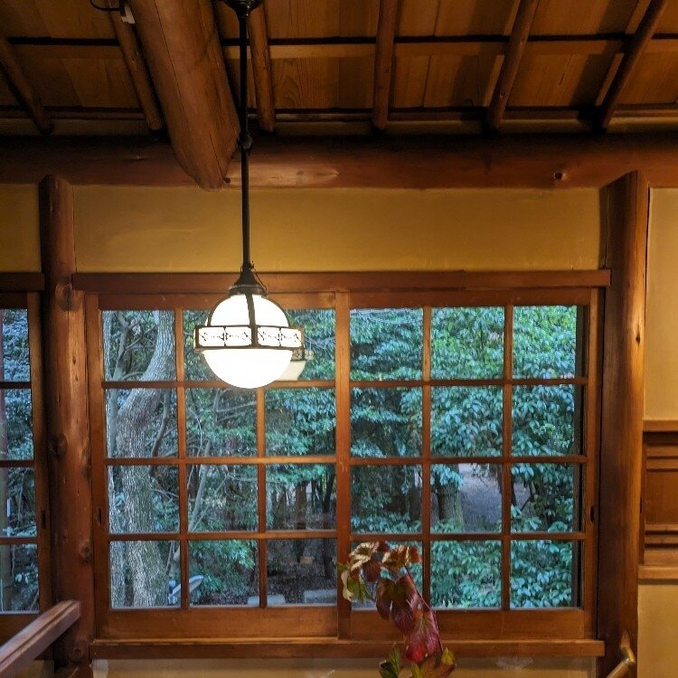 無事到着した入口から、木製の階段を上がり、目にした窓辺は、樹木が綺麗に眺められ、天井には、太い梁が数本、レトロな照明も美しい空間になっていました🥰