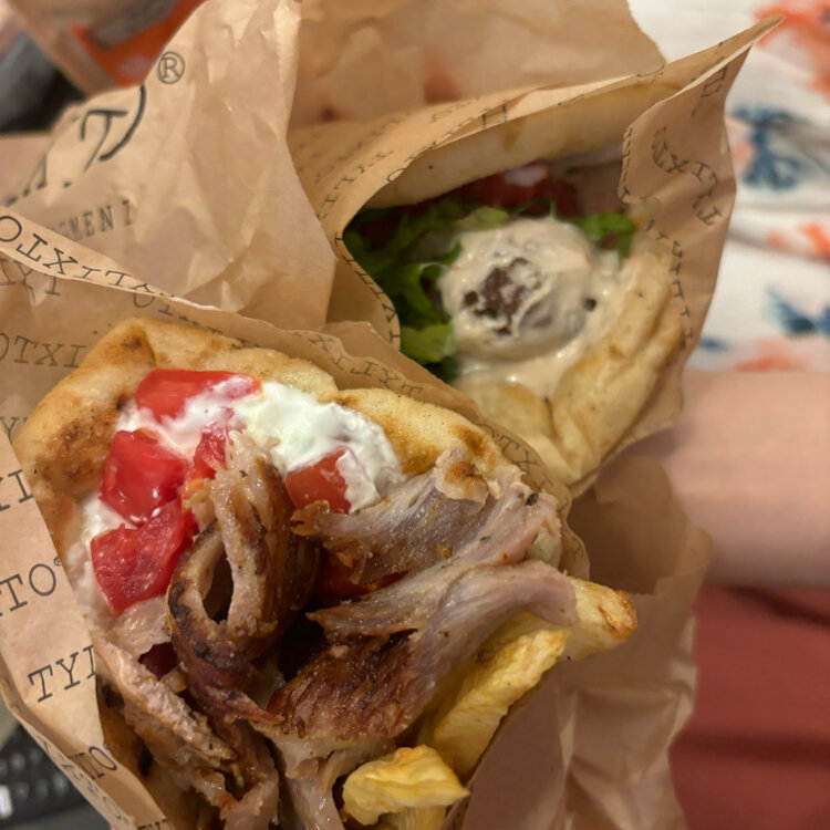 日本人にわかりやすく説明すると、ギリシャ版ケバブです。ギリシャでは安価なファストフードとしてよく食べられています。ケバブとの違いは、ピタパンという分厚いパンで包んでいるところと、ヨーグルトのソースとフライドポテトを入れるところです。お肉が重いと思ってもヨーグルトソースのおかげでさっぱりするので、胃もたれせず美味しく食べられます!