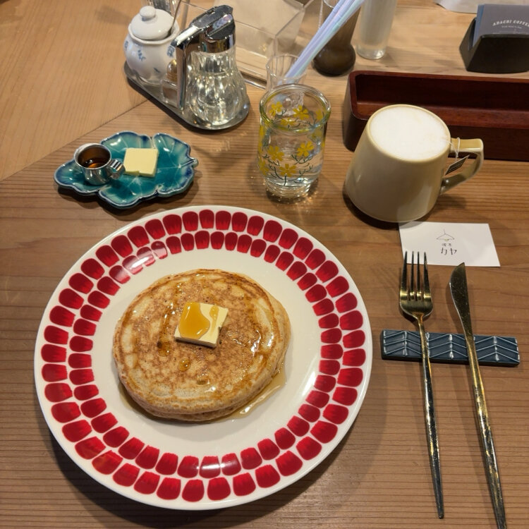 喫茶カヤ しっかりめのパンケーキは美味しいし、ミルクティーもカフェオレも泡がもこもこで最高✨😋 👛現金、PayPay、d払い、メルペイ