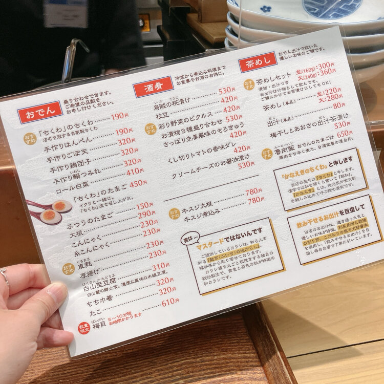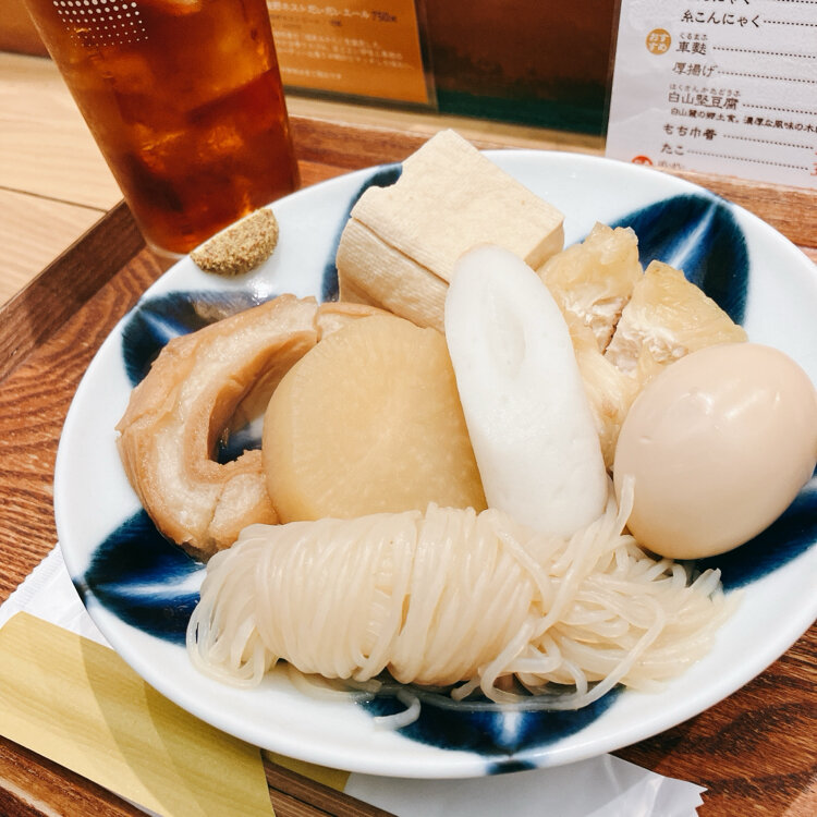 おでんは『ちくわ』『ロール白菜』『たまご』『大根』『糸こんにゃく』『車麩』『白山堅豆腐』をチョイス🍢 どれも美味しかったのでしが、店名にもなっている ちくわはモチモチしていて、とても美味しかったです。後から調べた情報だと、練り物はすべて自家製だそうで✨もっと練り物を注文しておけば良かったです😭