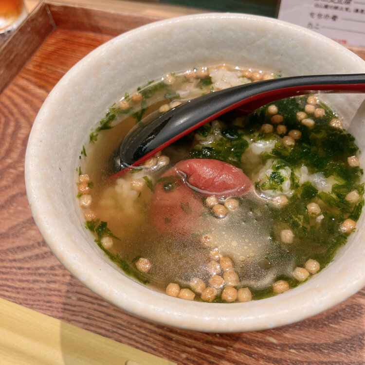 ごはんものを食べたくて『梅干しとアオサの出汁茶漬け』もいただきました。とにかく出汁が美味しくて!1日中歩き疲れた体に染み渡りました😌