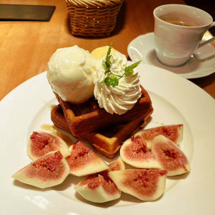 アーティゾン美術館で山口晃氏のJam Session 観覧後に、ふとフルーツ食べたくなってランチどきに飛び込み、いちじくのワッフル。甘いフルーツではないけどふわふわとプチプチの食感大好き。 #秋さんぽ