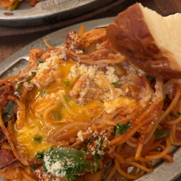 鉄板ナポリタンに厚切りベーコン、卵とチーズがたっぷりトッピングされていて、本当に最後のひと口まで美味しかったです。