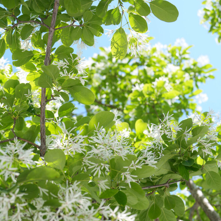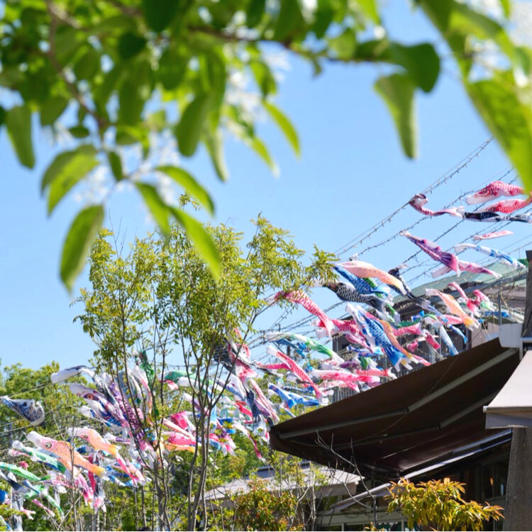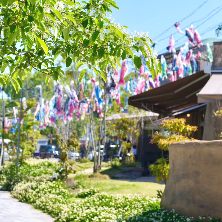新緑の美しい季節、青空に泳いでのぼる鯉と木々の緑と白いお花。とても清々しい気持ちになりました。