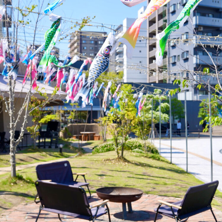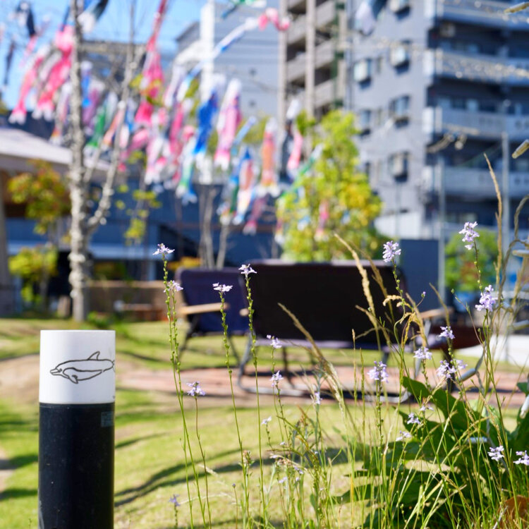 街の中心部にも近い電車通りにある加治屋まちの杜公園。大きな公園で芝生やお花も綺麗で、桜島も見えます。その公園の奥にはバーベキューなども楽しめるレストランがあり、そのあたりにたくさんの鯉のぼりが泳いでいました。