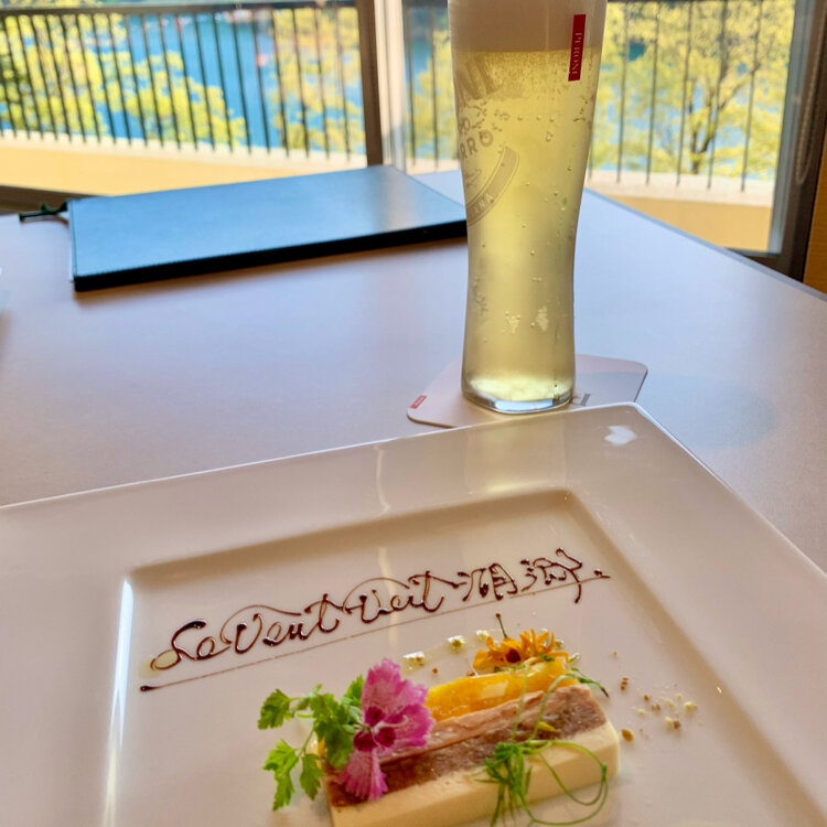 猿ヶ京温泉にある イタリアンが食べられるホテル フルオーダースタイルの オールインクルーシブなので 食べたいものを好きなだけオーダーして 作りたてをいただけます 写真はオレンジと鴨肉のテリーヌですが お皿に書かれたホテル名のチョコレートを 付けると