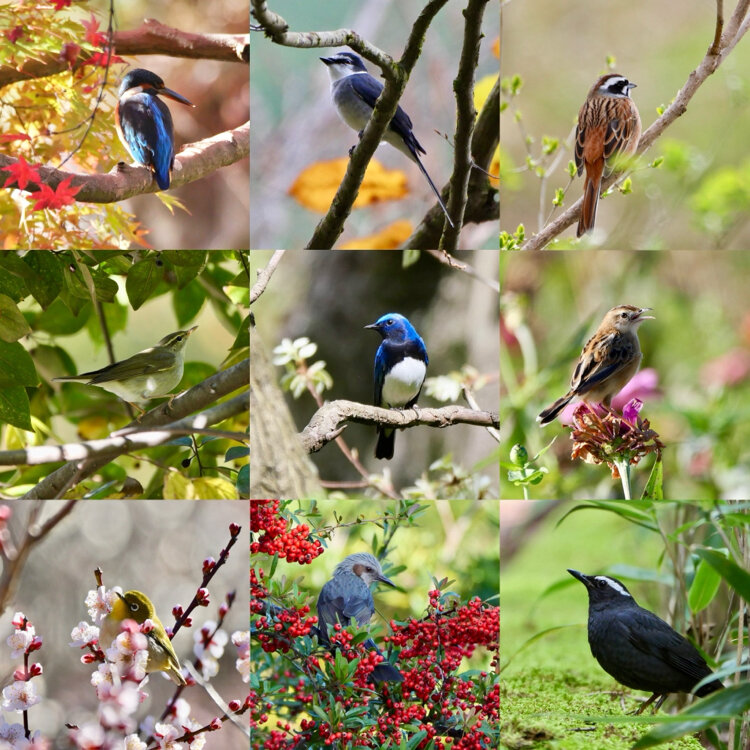 自然界の「アート」な存在・:* 🎨🕊️ 2024年に撮影できた日本の野鳥たち📷 名前は左上から。。。 カワセミ/リュウキュウサンショウクイ/ホオジロ メボソムシクイ/オオルリ/セッカ メジロ/ヒヨドリ/マミジロ (⇩野鳥の漢字表記も大好きなのでそちらも…) 翡翠(川蝉)/琉球山椒食/頬白 目細虫食/大瑠璃/雪加(雪下) 目白/鵯/眉白