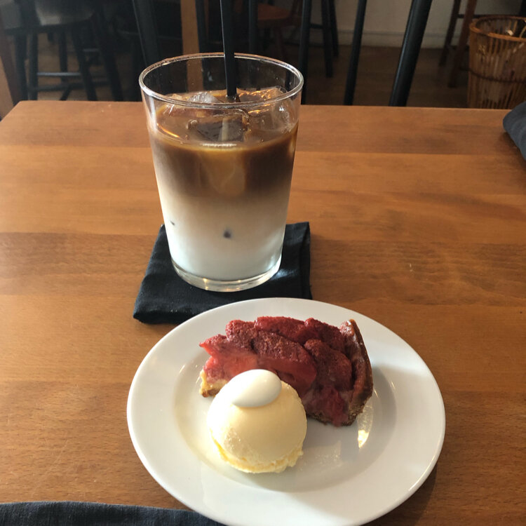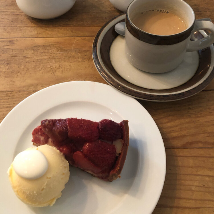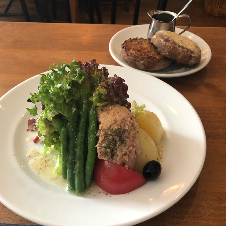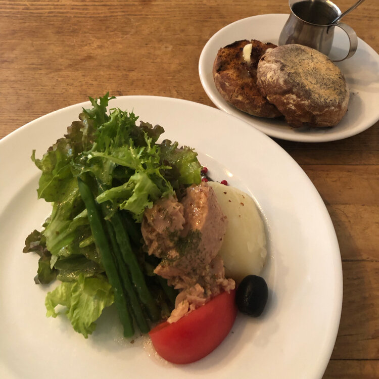 cafe de lento@元町 ニース風サラダが食べたくて横浜へ! 平日でも満席で30分程待ちました サラダとマフィンのセットに焼き苺のタルト、ホットのカフェオレをオーダー カフェオレはミルクと追加のコーヒーがピッチャーで提供されます たっぷり2杯分いただけるのでうれしい インテリアも素敵でスタッフさんもかわいくて優しくて癒されるお店です