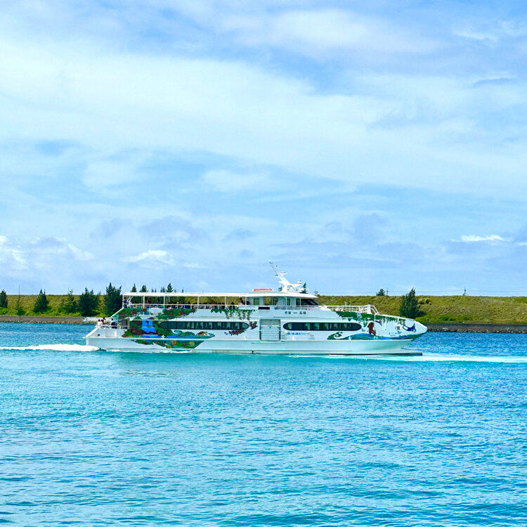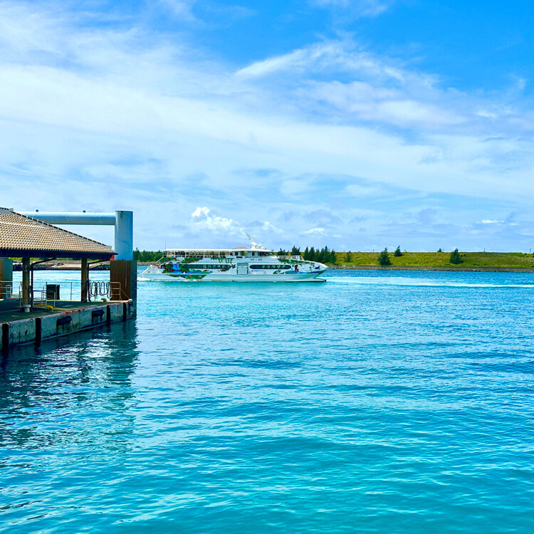 目の前にはちょうど出港した竹富島行きの旅客船。船体には八重山の自然が描かれています。