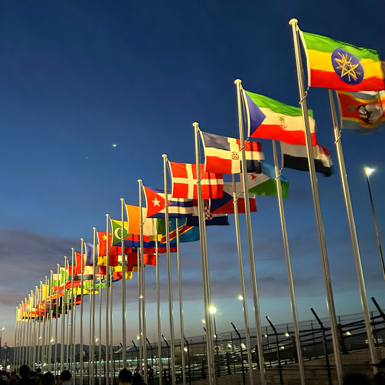 ライトアップされた参加国などの167の旗(海外の158の参加国・地域、7つの国際機関、日本と博覧会国際事務局(BIE)の旗)に見送られて会場を後にしました。